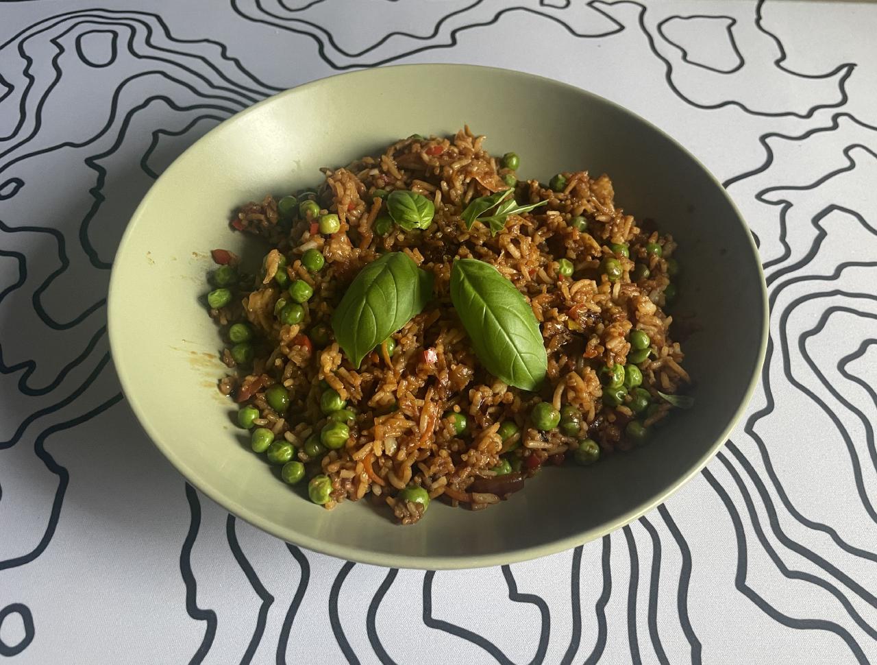 ### Steps 1. **Preheat pan:** Start heating a large pan or wok with some olive oil. 2. **Prepare Ingredients:** Finely chop the onion, bell pepper, and tomato. 3. **Cook Vegetables:** - Firstly, add the red onion and cook it for a bit until it softens. - Add the chopped bell pepper and sauté until it begins to soften. - Add the green peas and chopped tomato, and cook for another 2-3 minutes. 4. **Combine:** Add the cooked rice to the pan. Mix everything together and season with salt and pepper. 5. **Serve:** Transfer to a plate. Top with fresh basil and optionally sprinkle some hard cheese and a squeeze of lemon on top.
