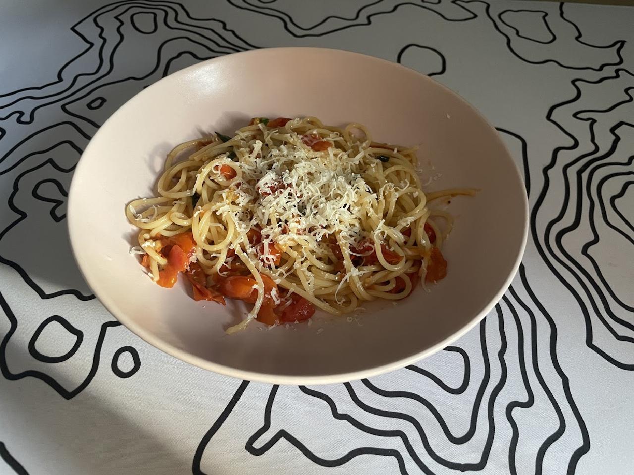- Put onto a plate and top if with some hard cheese. Enjoy the authentic pasta pomodoro!