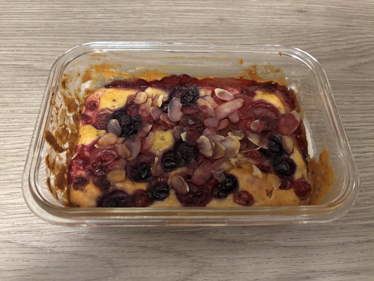This is a high protein pancake bread, that fills you up for a long time, and feels very satisfying, you can also make it into a portable glass container (oven-safe) and take it to work. This should be an okay portion for a sweet lunch (but of course you’re always gonna want more, because of how good it is).